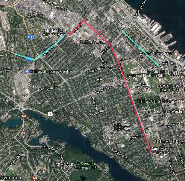 拜耳路和哥廷根街——这是哈利法克斯运输公司共同前进计划中确定的唯一走廊——肯定会被研究。另外两条走廊“暂时”出现在名单上:Young Street(从robbie到Windsor)和robbie Street(从Young一直到Inglis)。