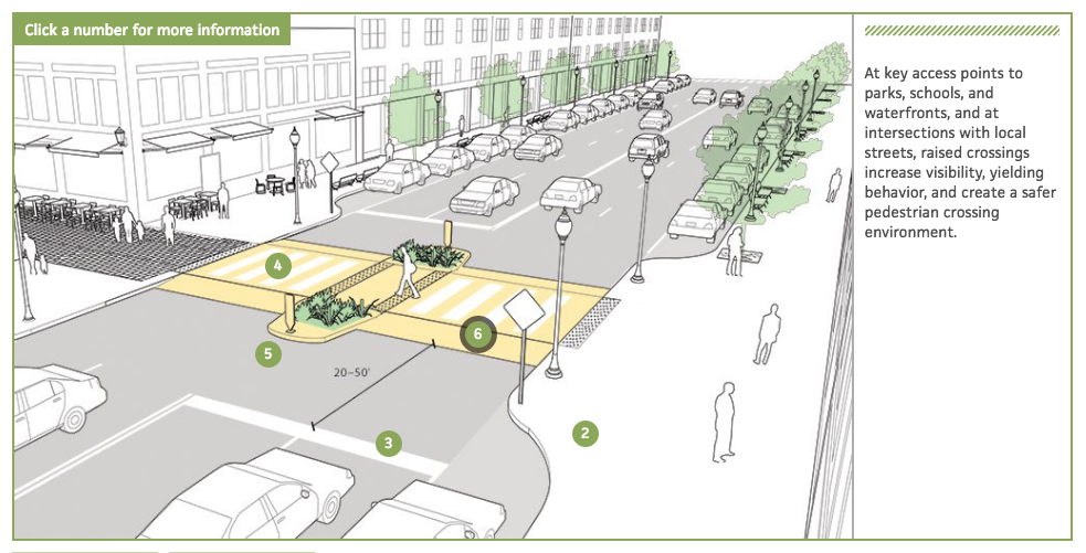 Collins的概念是在有标志的人行横道前面加上减速带,这让我想起了NACTO (全国城市交通官员协会) 工具箱:速度表,养了人行横道,甚至提高十字路口它可以使行人保持在人行道的高度(不需要在路边抄近路),并使司机在过马路时减速。