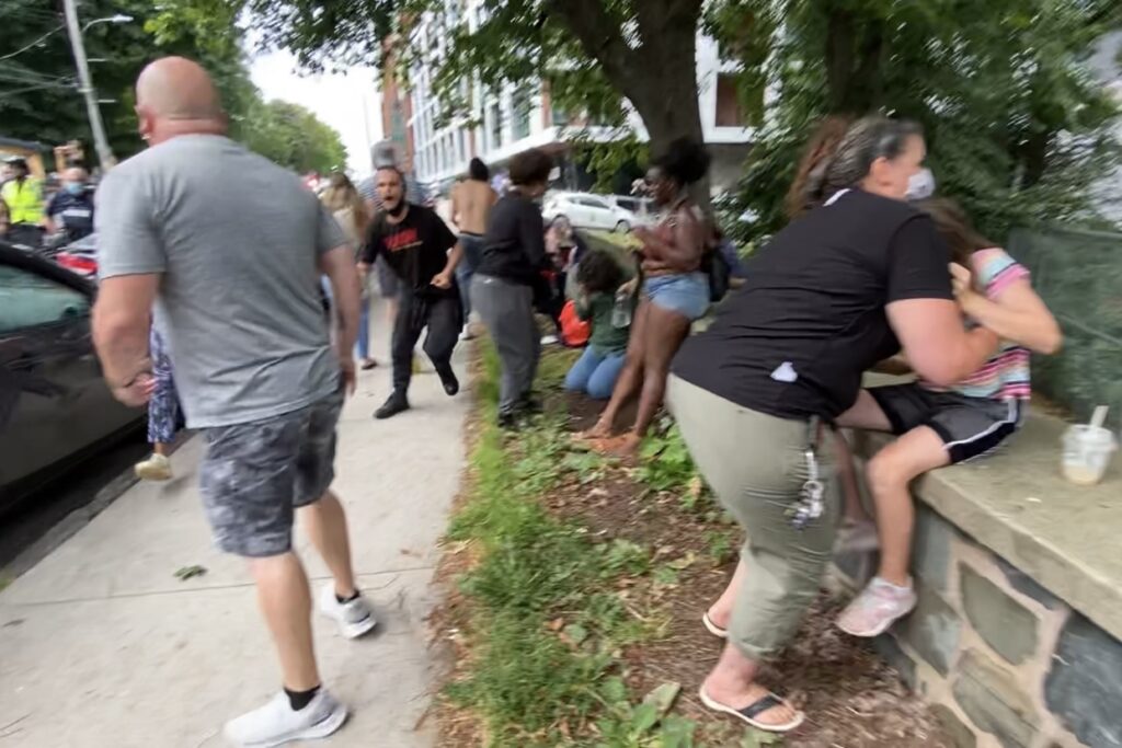 大约在同一时间,抗议者冲进停在道尔街人行道上的一辆警车,试图阻止一名被捕的抗议者开车离开。骑自行车的警察包围了这辆车,费根和他的女儿被夹在了对立的两边。