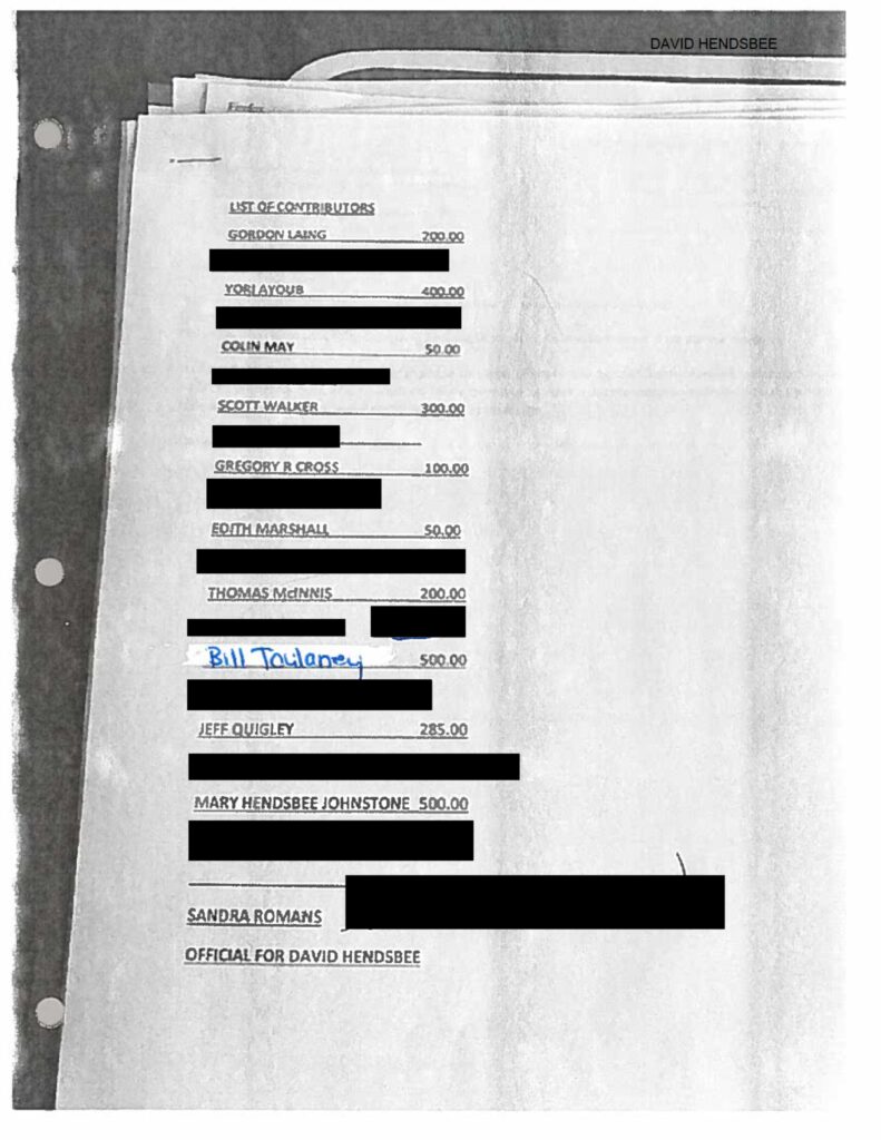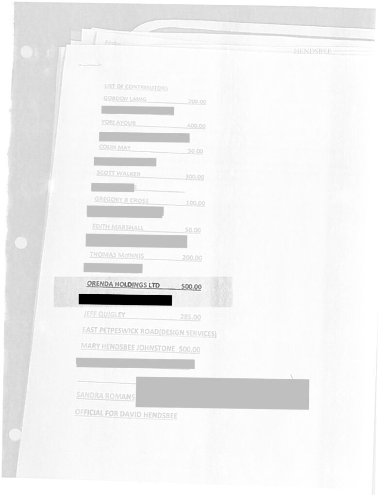 来自库恩的一页。David Hendsbee的竞选捐款声明,其中突出了奥伦达控股有限公司的捐款。-人力资源管理截图/赞恩伍德福德插图