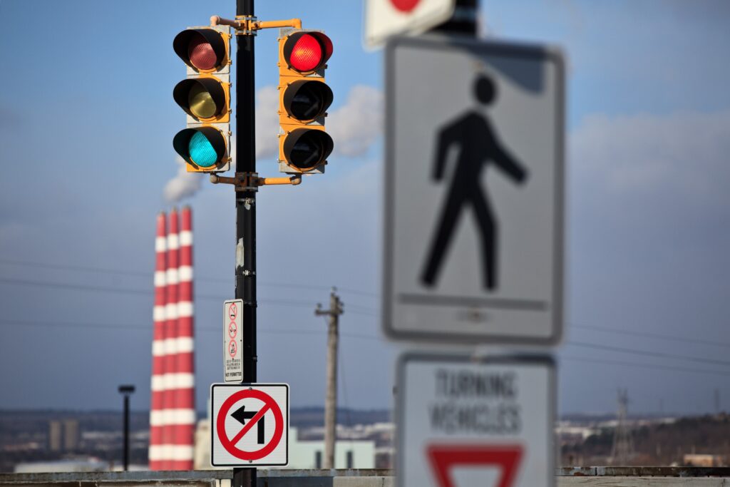 2018年哈利法克斯麦克唐纳大桥附近的十字路口的交通灯和标志。-图片:赞恩·伍德福德