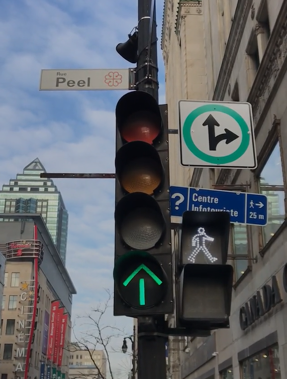 在那个十字路口,左转是不允许的,右转是被限制的,直到行人通过为止。当绿色箭头被点亮时,行人可以通过,而不必担心分心的司机转向他们。蒙特利尔也不允许红灯时右转。