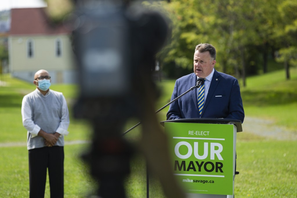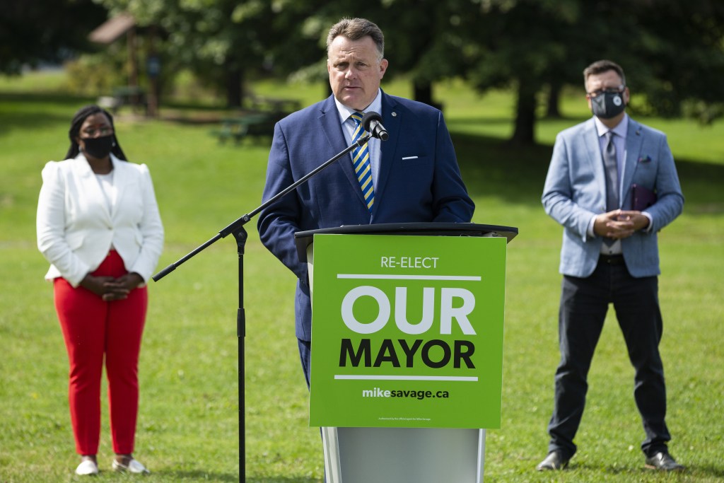 周二,在哈利法克斯的非洲维尔公园,市长迈克·萨维奇在他的连任竞选启动仪式上摘下口罩走向讲台。-图片:Zane Woodford