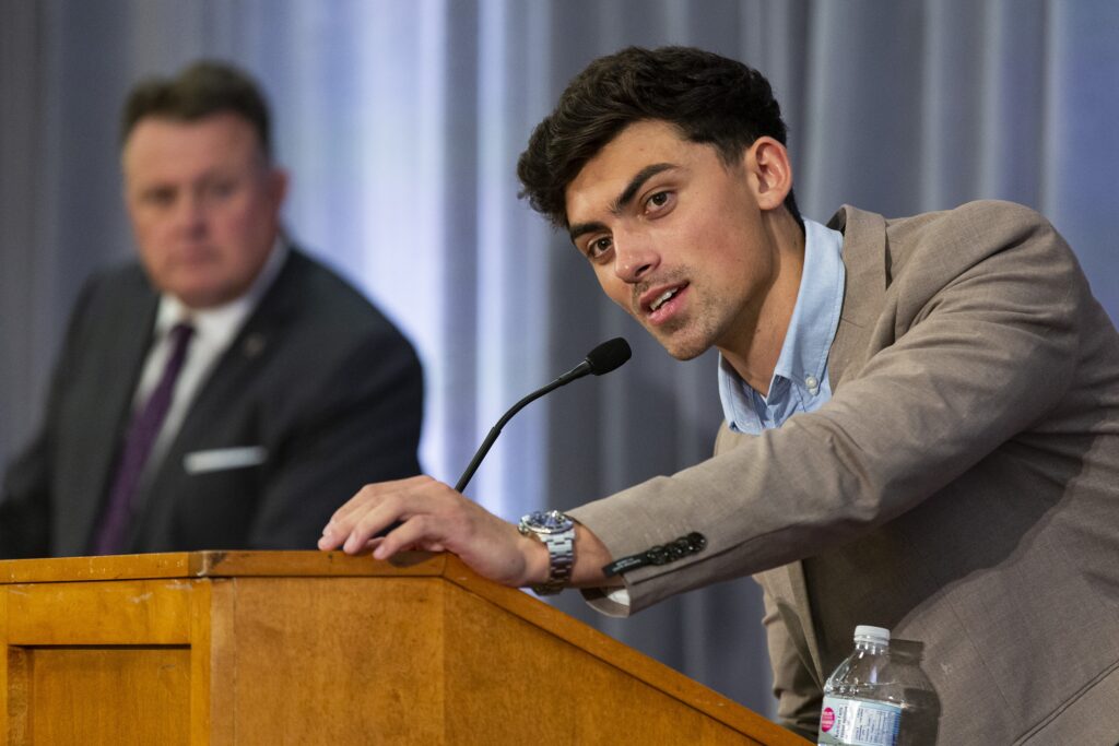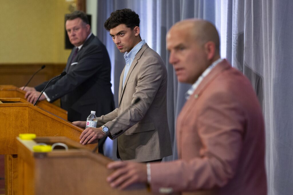 (从左至右)市长迈克·萨维奇、马克斯·泰勒和库恩。马特·惠特曼在周三的市长候选人论坛上发言。照片:赞恩伍德福德