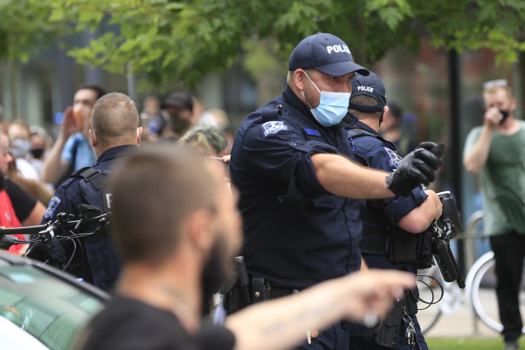 2021年8月18日,在布伦瑞克街,一名哈利法克斯地区警察在将一名被捕男子押送到巡逻车时威胁要向抗议者喷洒胡椒喷雾。图片:赞恩·伍德福德