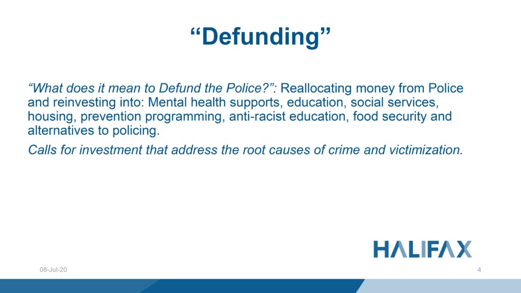 那警务专员的哈利法克斯局通过defunding警察的定义,它支持在人力资源管理,包括监管作用: