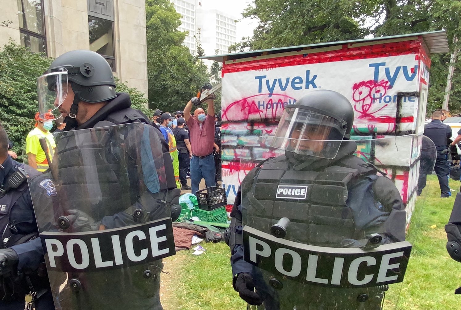 哈利法克斯考官除了抗议者没有使用感觉刺激剂。净化导致的牛奶和水,其中大部分是在警察开始辣椒喷洒的人后被带到现场。人们在警察开始吞吐水瓶,警察开始辣椒喷洒,并且再次作为市政工人将电锯拿到第二次临时庇护所。