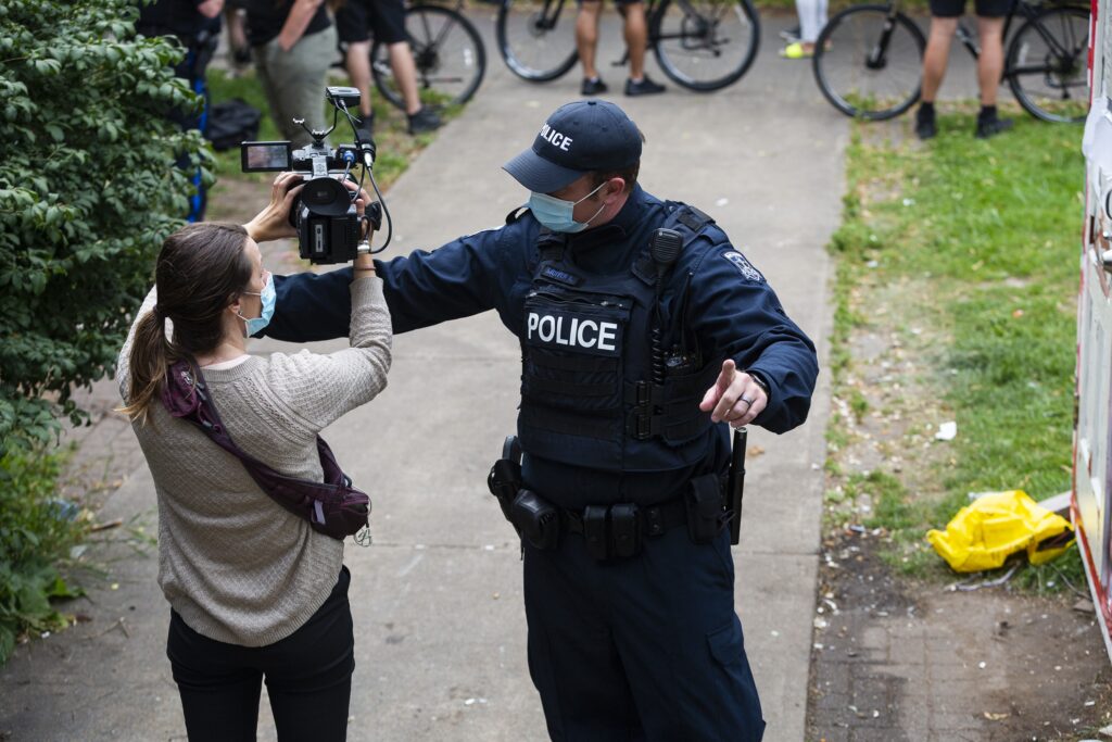 哈利法克斯地区警察。周三早上,卡尔·麦克弗试图用身体移动CTV记者萨拉·普洛曼,当时她正试图拍摄警察逮捕她的过程。现场的警察多次威胁要逮捕记者,并试图控制他们的行动。-照片:赞恩·伍德福德