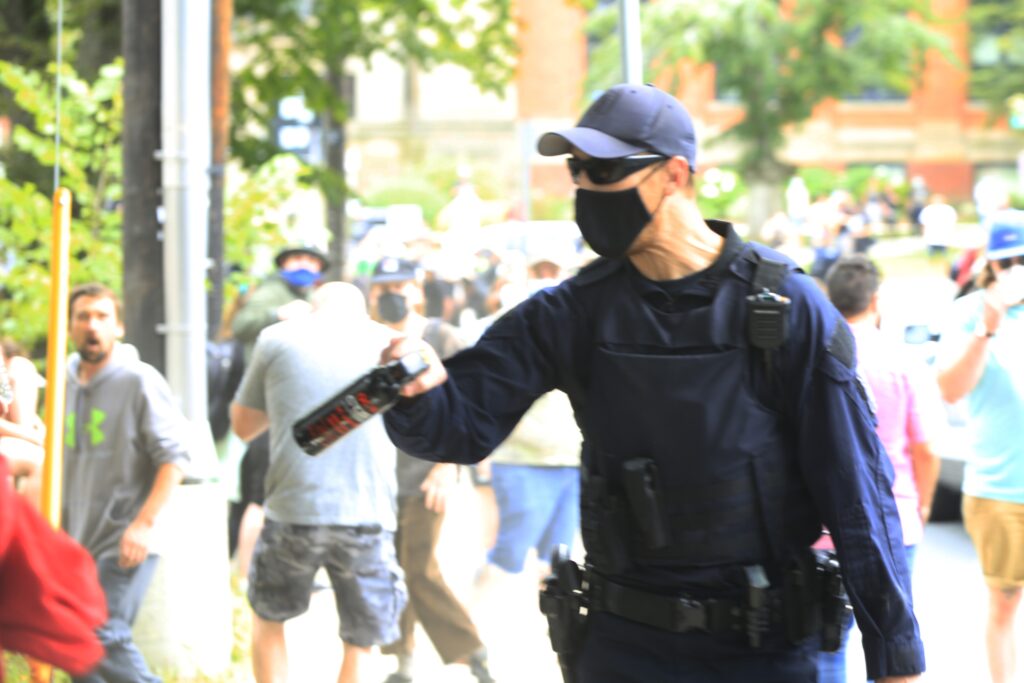 一名没有姓名标签的哈利法克斯地区警察向坐在墙上的抗议者喷胡椒,帮助那些已经被喷过胡椒的人。-照片:赞恩·伍德福德