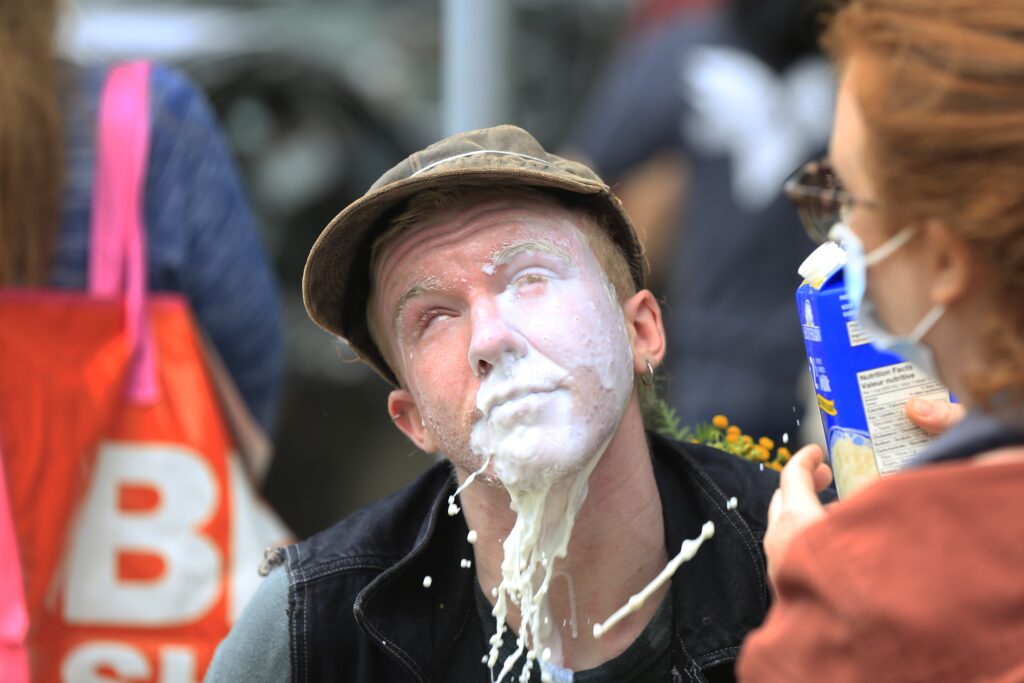 周三,在布伦瑞克大街,一名抗议者将牛奶倒入另一名刚刚被哈利法克斯地区警察喷洒胡椒喷雾的抗议者的眼睛。-照片:赞恩·伍德福德