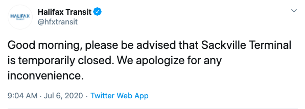 哈利法克斯过境站在推特上上午9点刚过。萨克维尔终点站暂时关闭。