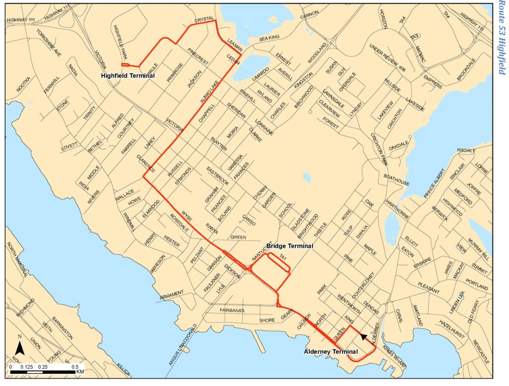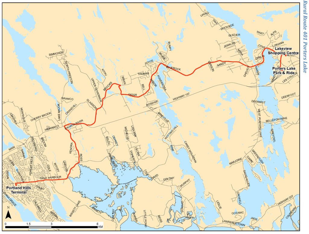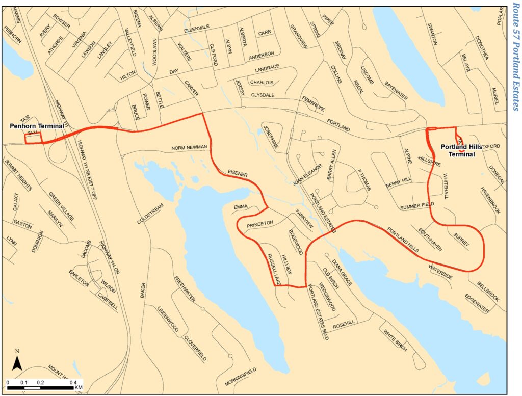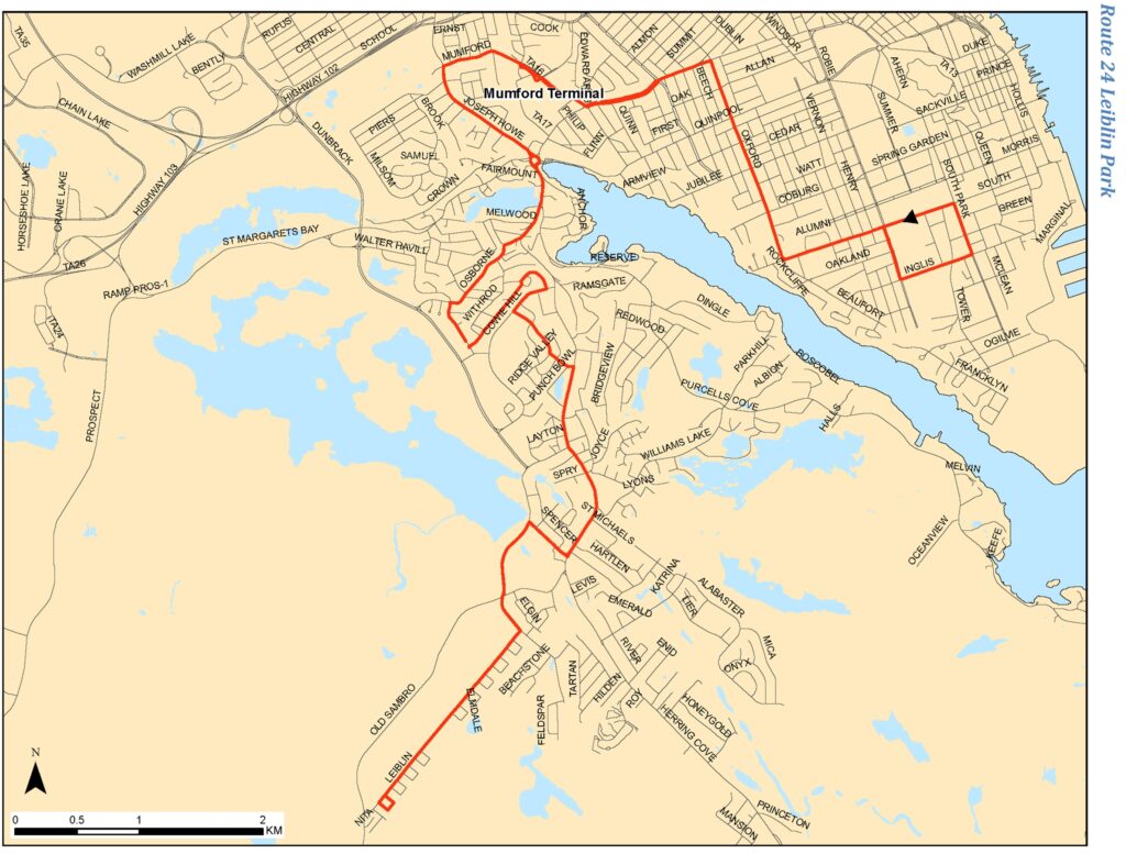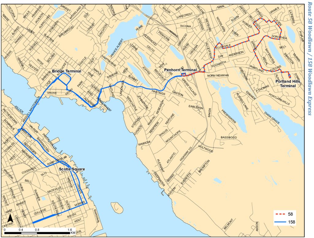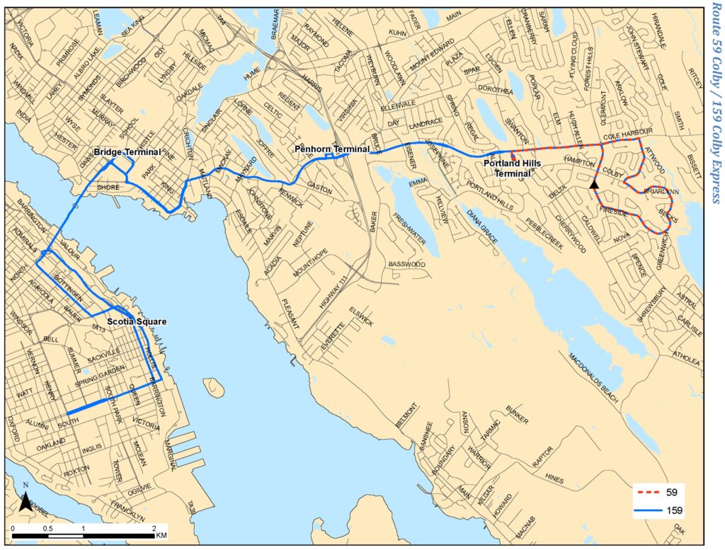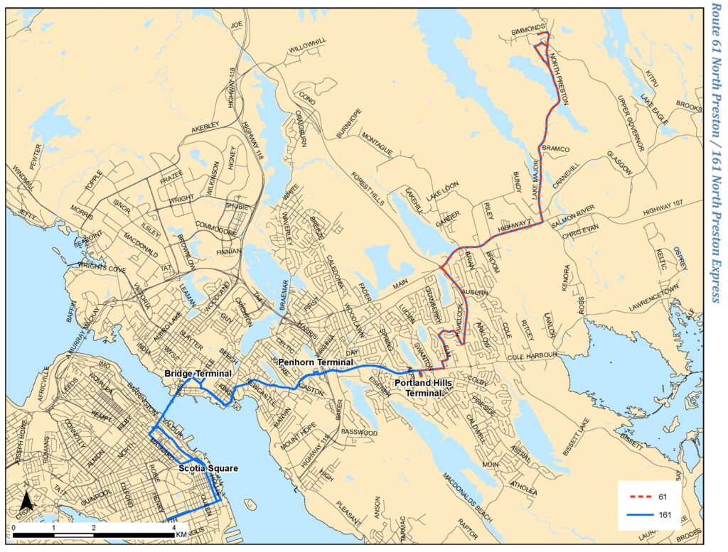 在波特兰山终点站,这条路线会在非高峰时段掉头,但在高峰时段,它会继续沿着161号公路北普雷斯顿特快(North Preston Express)前往哈利法克斯市中心。