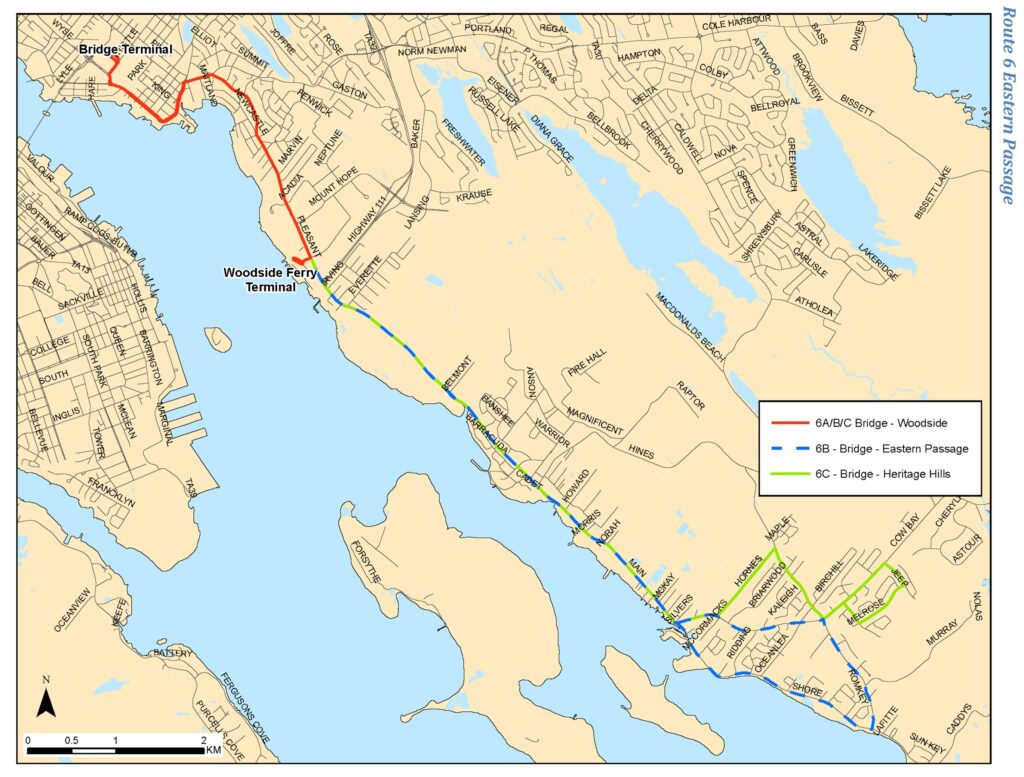 在东部通道和伍德赛德,60号和63号公路将被新的6号公路取代。这条替代品,像5号一样,也是一条走廊路线。这也是哈利法克斯运输公司所谓的“支线”路线,有6A、6B和6C路线,“分别服务于伍德赛德、东部通道和遗产山”。