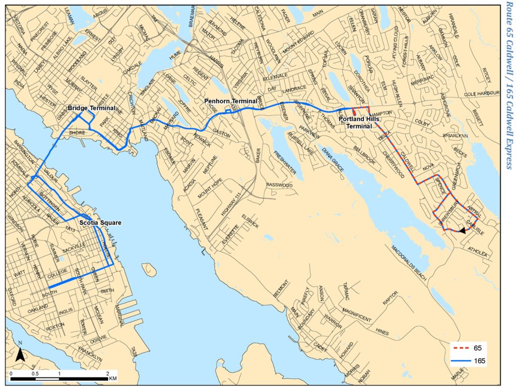 修订后的65号公路运营方式与58号、59号和61号公路类似——从考德威尔到哈利法克斯市中心的高峰快递服务通过165号考德威尔高速公路运行。