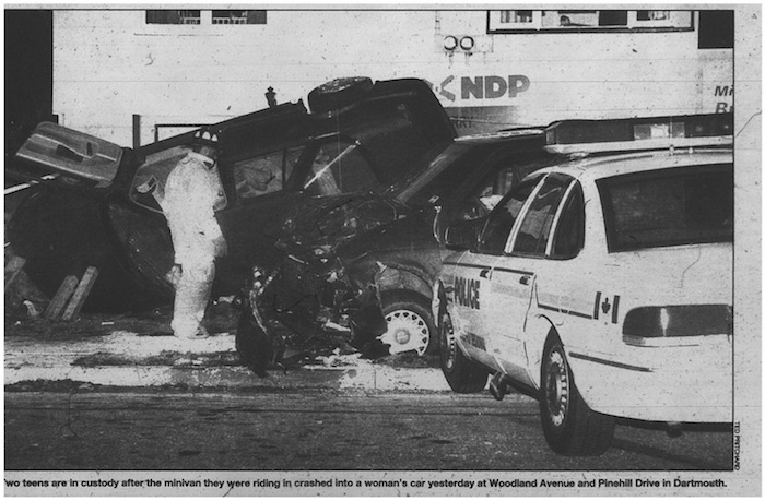 Cromwell似乎是指1998年3月11日的事件,涉及两个偷走了克莱斯勒魔法车的青少年。“哈利法克斯地区警察组织表示,当一辆标记警车的巡逻官试图拉过绿色小型货车时,追逐在下午4:30左右开始。Gary Martin,“克里斯拉梅西在日本早上在日常新闻中。