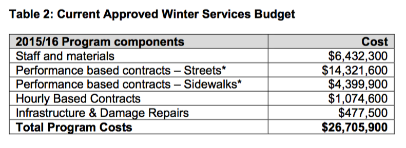 2016年1月26日,向委员会提交了一份题为《街道和人行道冬季服务标准》的报告。由于由公司内部工作人员清理的街道和人行道的类型与绩效合约所清理的街道和人行道的类型有很大的不同,而且标准也不同,因此直接比较公里数和公里数的收费并不实际。但不管怎样,它在这里。