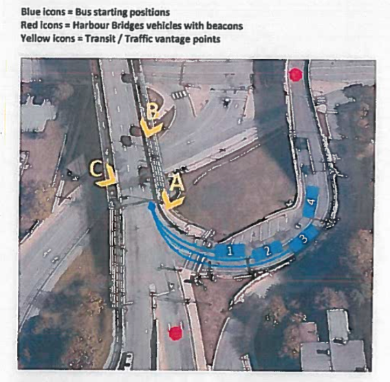 在大约五个月的时间里,我们没有再就这个问题进行电子邮件沟通,直到5月份媒体询问(我的)到来,然后在6月份,哈利法克斯运输公司的规划和调度经理帕特里夏·休斯(Patricia Hughes)请求大桥委员会批准在匝道上进行公交车的现场测试。(虽然我很愿意相信媒体的要求很重要,但并不是媒体的要求刺激了休斯的测试计划,而是哈利法克斯运输公司(Halifax Transit)在不可避免的、可怕的考斯韦尔(Cogswell)建设阶段需要改变公交车路线的可能性,休斯在几封邮件中提到了这一点。)