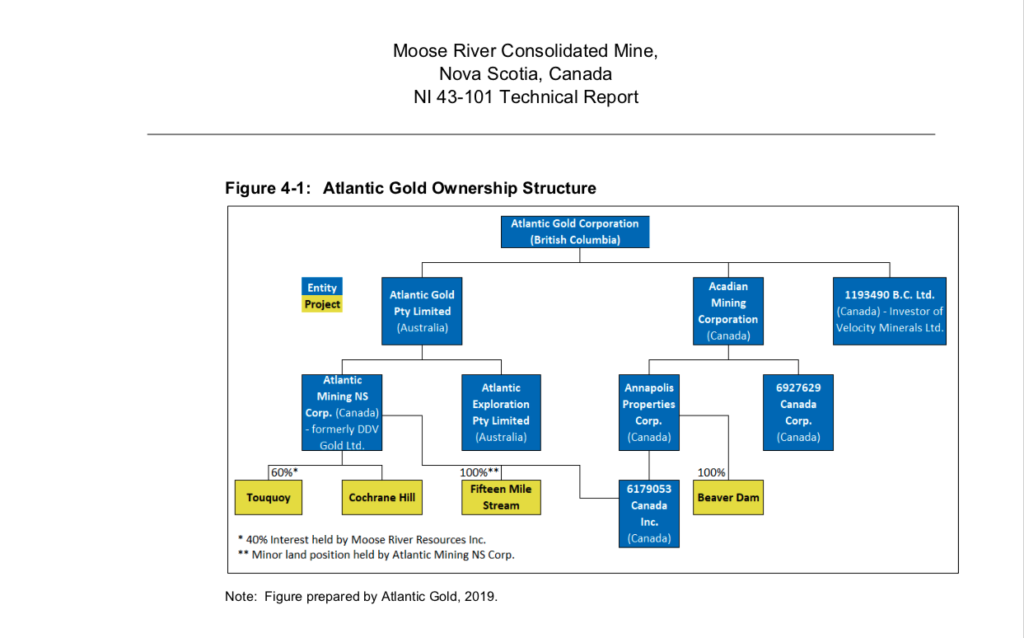 Atlantic Gold于2019年5月收购前的公司结构。大西洋黄金现在是“圣。芭芭拉有限公司”。