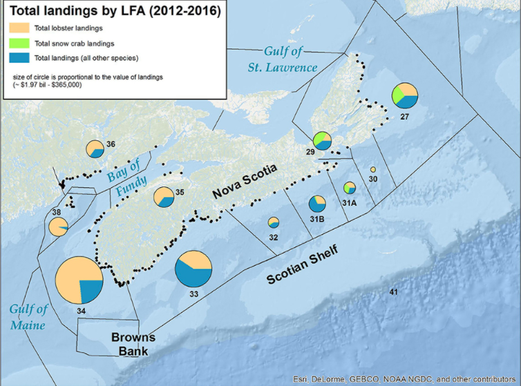 DFO在加拿大东部识别并管理着四个独立的龙虾捕捞区,其中两个在新斯科舍省附近滨海诸省地区包括芬迪湾和大西洋海岸(以及LFA 34, Sipekne 'katik人在那里从事适度的渔业生计),以及海湾地区,包括诺森伯兰海峡和圣劳伦斯湾。