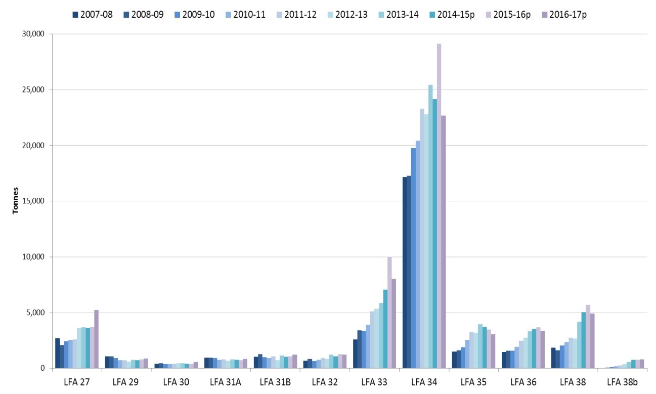事实上,当你查看LFA 34的整体数据时,2018-2019年的着陆量从2015-2016年的创纪录高点28800吨降至2.1万吨。在此期间,该地区的土地价值也从4.16亿美元降至4.04亿美元。