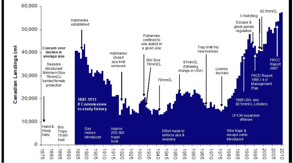 1995年,就在几乎所有具有商业价值的底栖鱼物种灭绝后不久,龙虾的捕捞量迅速增加,渔业资源保护委员会(Fisheries Resource Conservation Council)成立了报道对渔业和海洋大臣说:“我们索取太多,留下太少。”