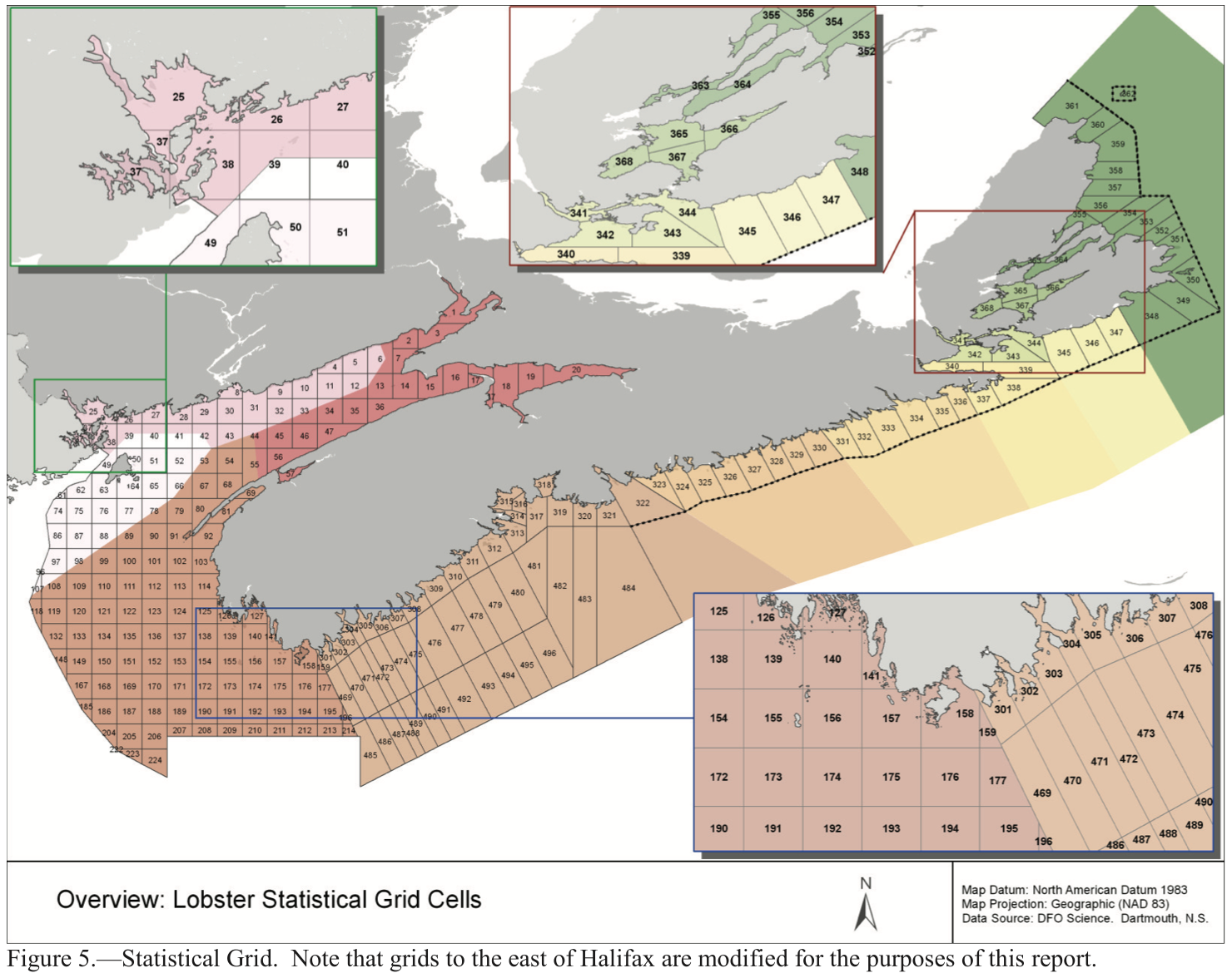 龙虾统计网格细胞,DFO。龙虾登陆的报告和分析在空间尺度的网格单元图中所示。