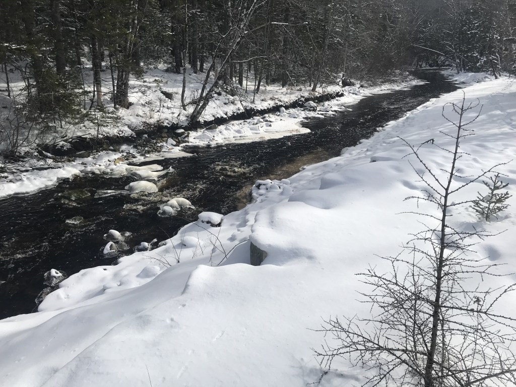 虽然这是一个寒冷的冬天,但基拉格河并没有结冰。就在剂量者的前方,水流从上游被称为卡梅隆流的静水中汩汩流过岩石,形成了微小的激流,最终流入西河,经过一系列阶梯状的平缓瀑布,在西布希港流入大西洋。
