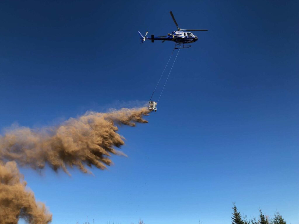吉利安·伦纳德负责管理秋季进行的直升机撒灰工作,她说,直升机携带一个特殊的桶,在起飞时称重,这样他们就可以测量撒在集水区的石灰量,通常每公顷约10吨。