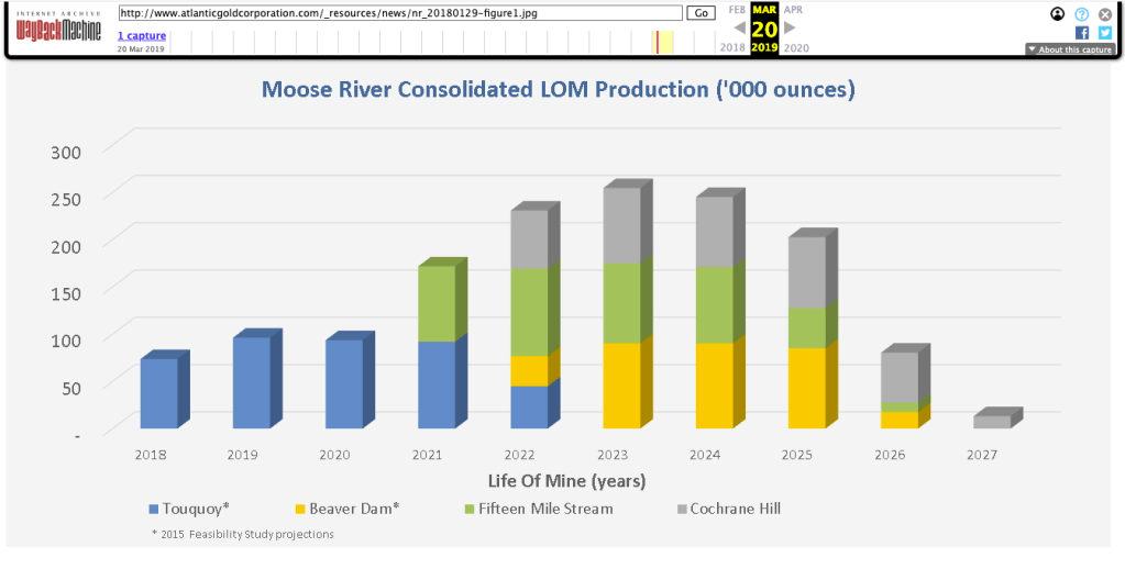 这三座新矿对该公司在新斯科舍省的持续采矿业务和黄金生产至关重要。根据穆斯河综合项目2019年5月的一份技术报告,这些矿山的生产是连续的。[2]随着Touquoy油田的生产逐渐减少,比弗水坝(Beaver Dam)应该已经开始生产,然后是15英里溪(15 Mile Stream)和科克伦山(Cochrane Hill)。从这些矿山压碎的矿石要用卡车运到麋鹿河进行氰化物处理,有时要经过数公里的公共道路。