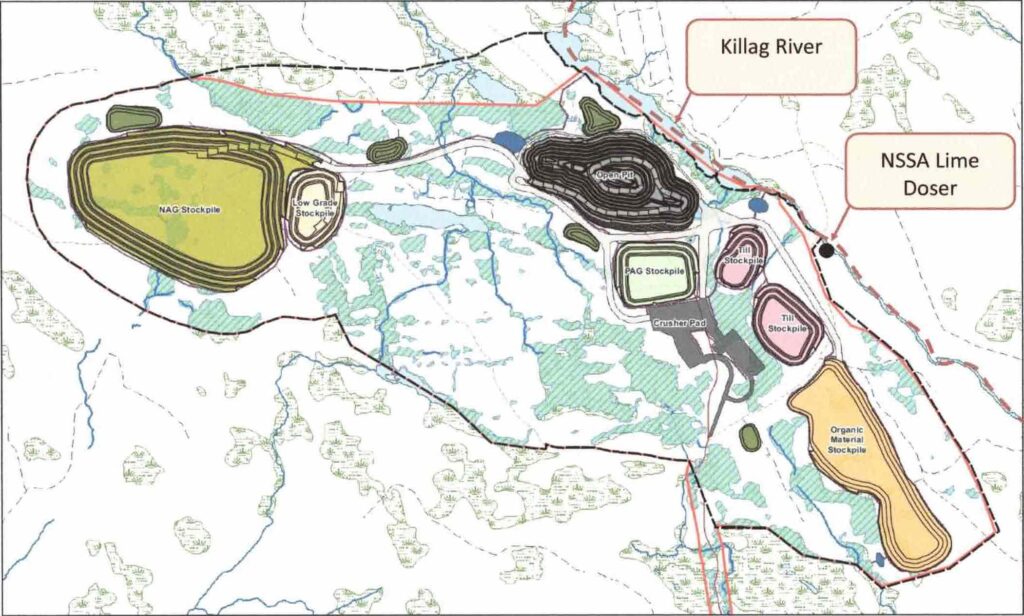 矿区的废料储存将包括6个表土库、2个挖矿库和2个不含矿石的废石库,总占地98公顷……这6个表土库的材料容量从0.04吨(40万吨)到0.20吨(20万吨)不等,最终平均海拔高度分别在海拔145米到170米之间。这两个till库存的产能将分别为230万吨(230万吨)和170万吨(170万吨)……