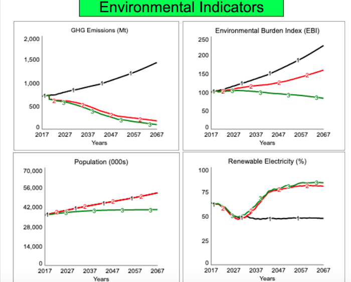 Peter Victor的互动模型截图,展示了三个场景(1 -基本情况场景或现状;2 -温室气体减排方案;3-可持续繁荣情景)以及它们如何影响50年期间的环境指标。