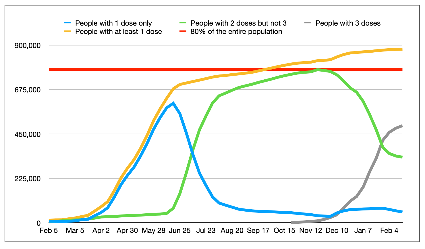 上图显示了流感大流行期间每周五的疫苗接种进度。黄线代表的是至少蓝线代表的是只有一剂。绿线表示服用了两剂而不是三剂的人。灰色的线是三种剂量的人。红线代表80%的人口。