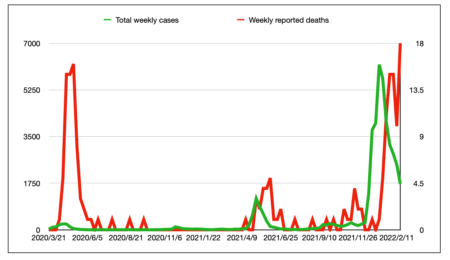 上面的图表显示了每周病例数(绿色,左轴)和每周死亡人数(红色,右轴)。