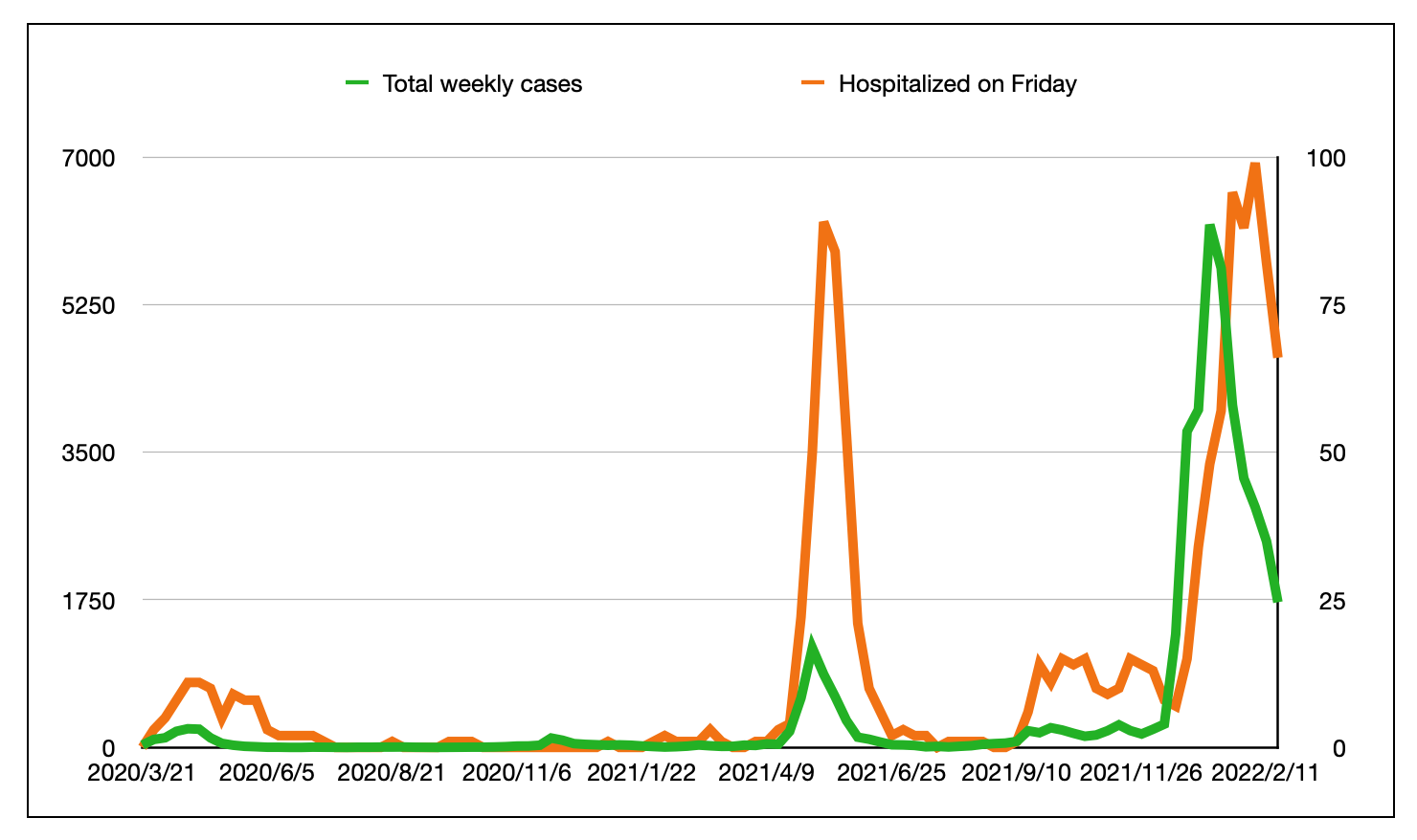 上图显示了疫情期间每周病例数(绿色,左轴)和周五住院人数(橙色,右轴)。