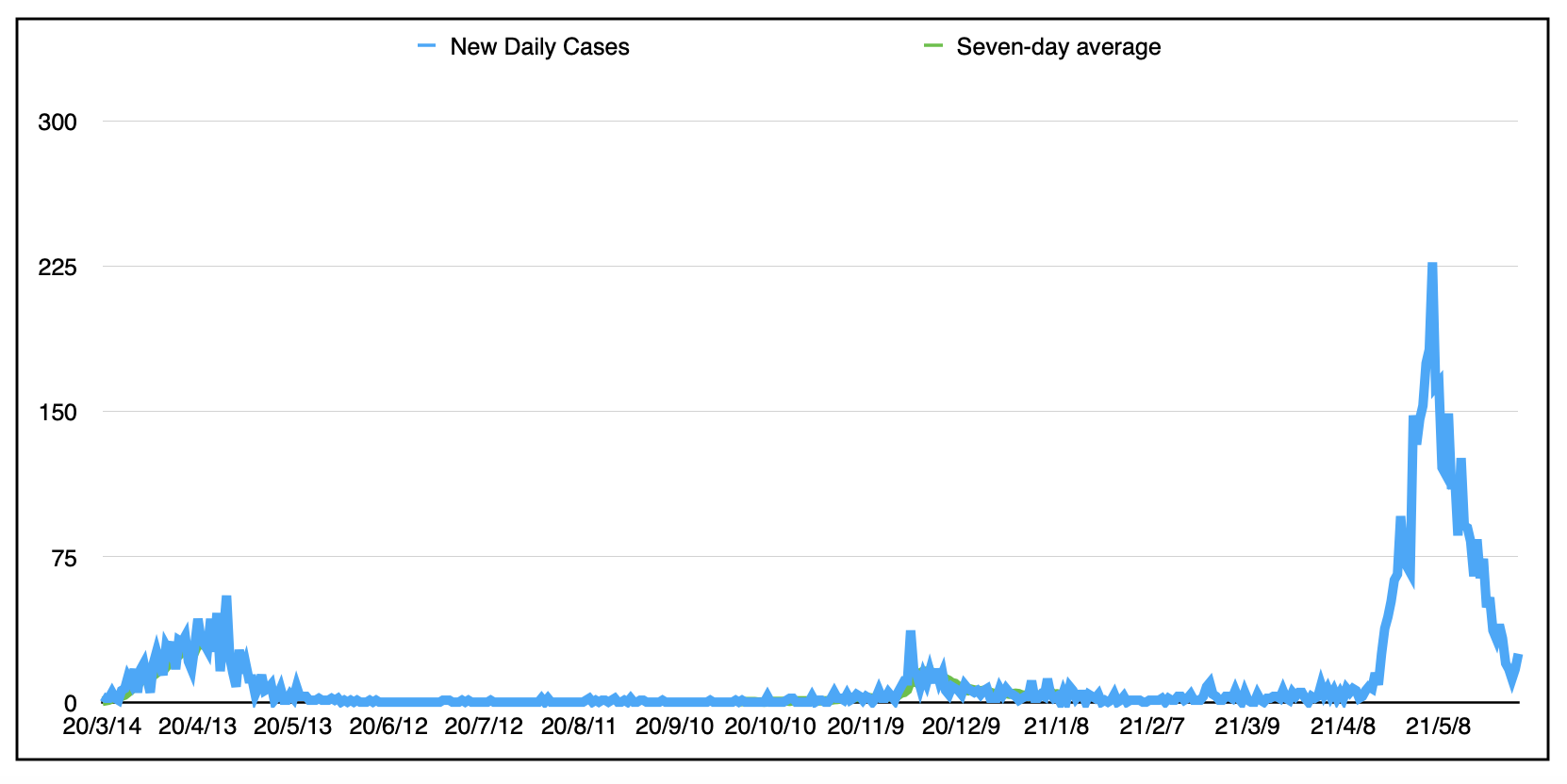 以下是日常新案例数量和七天的滚动平均值(今天在23.4)以来,自3月28日以来,新天斯科舍省的新天性日常零: