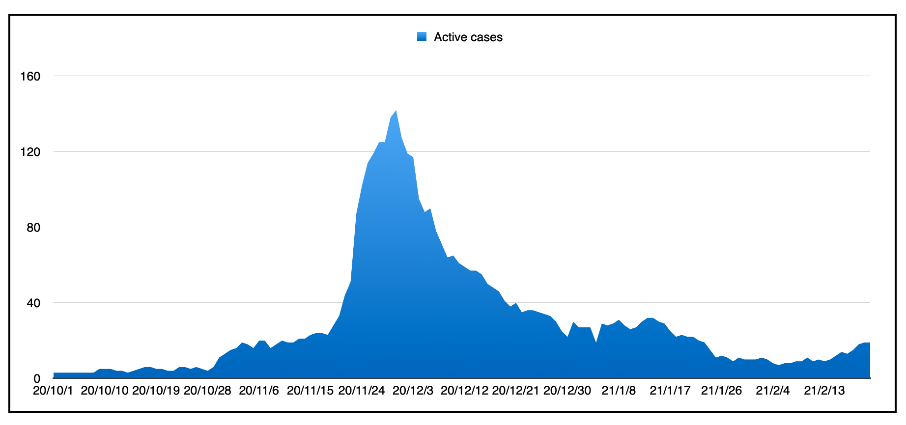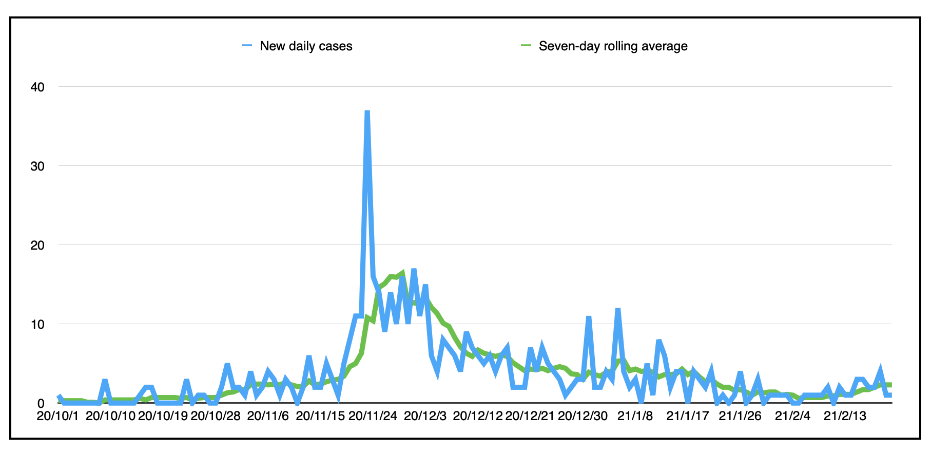 Here are the new daily cases and seven-day rolling average (today at 2.3) since the start of the second wave (Oct. 1):
