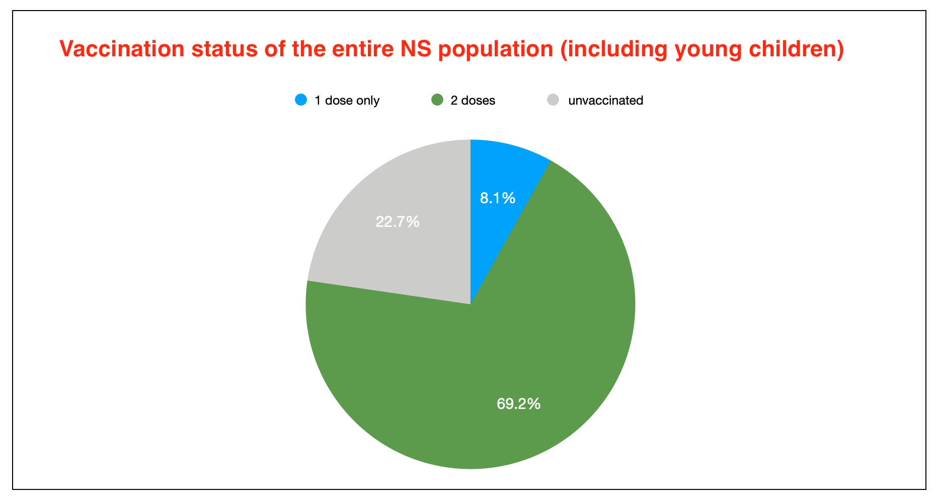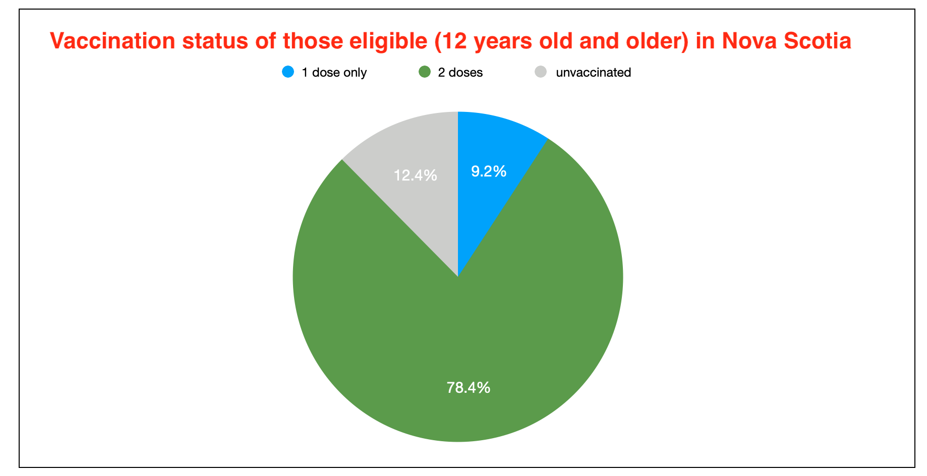 在符合接种条件的人群(12岁及以上)中,87.6%至少接种了一剂疫苗,78.4%接种了两剂疫苗。这是我的粗略估计,用的是我对人口年龄群的最佳估计。