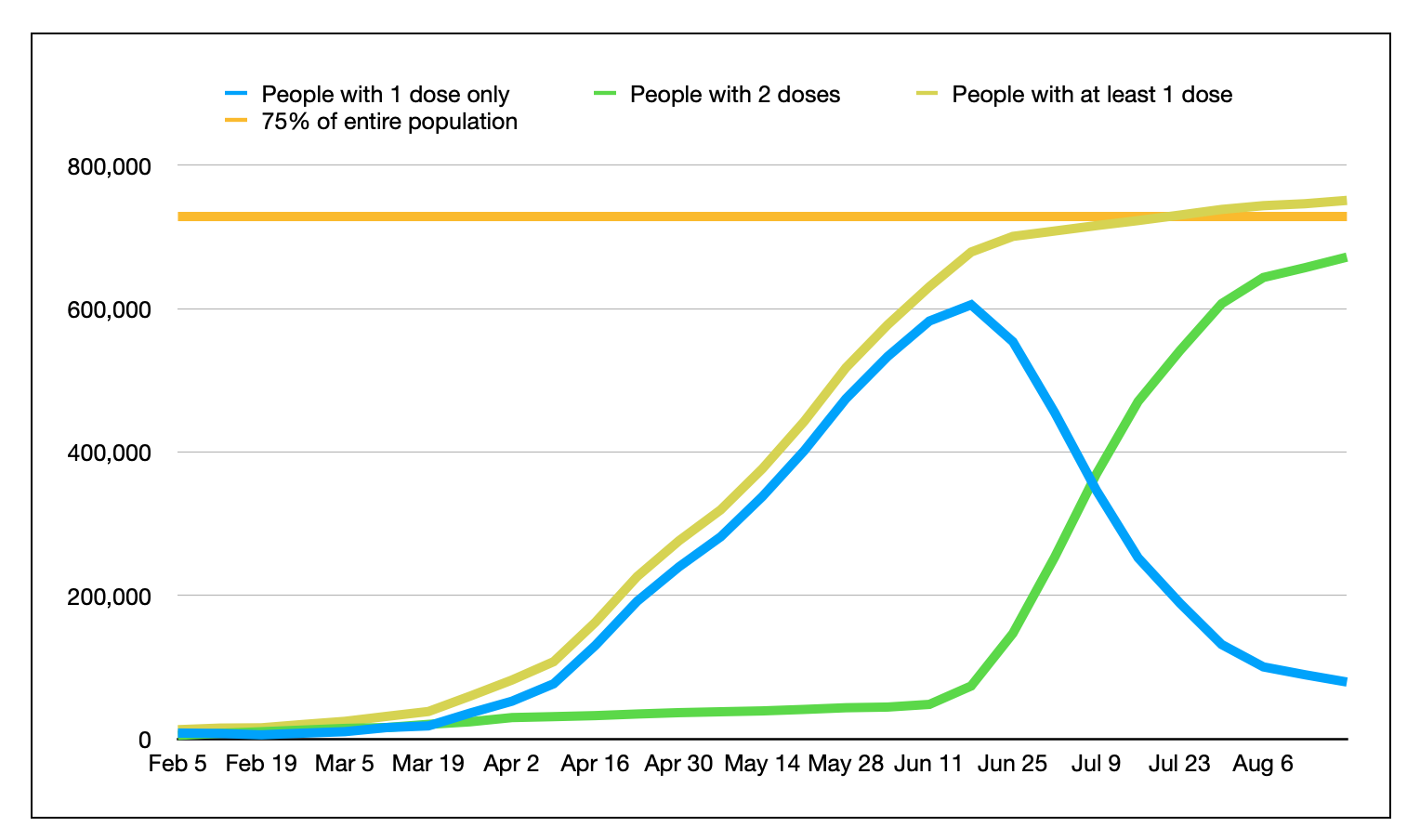 上面的图表显示了疫苗接种随着时间的推移所取得的进展,每个星期都是在周五。蓝线是只服用一剂的人;绿线是服用两剂的人;黄线代表至少服用一剂的人群,橙色线代表75%的人口。