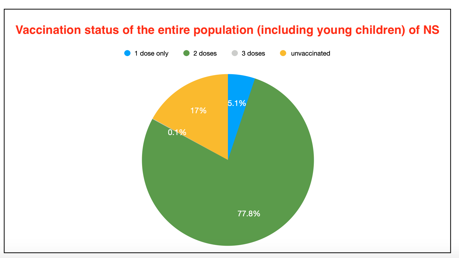 截至昨天一天结束时,83.0%的人口(包括幼儿)接受了至少一剂疫苗,77.9%接受了至少两剂疫苗。