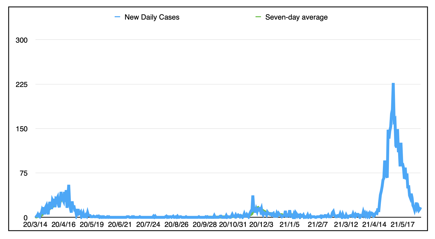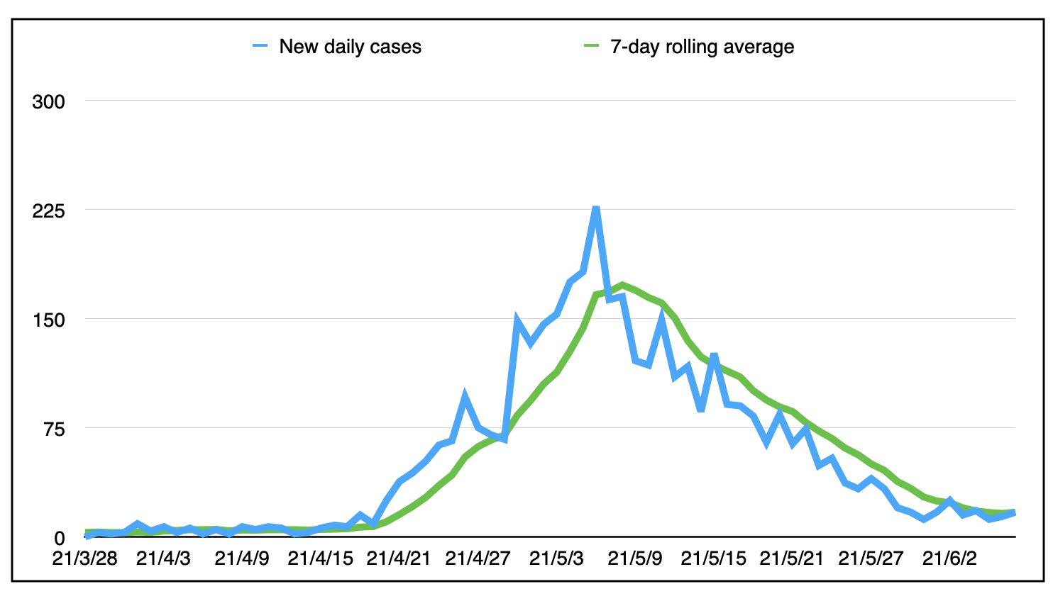 以下是每日新案例数量和七天的滚动平均值(今天16.9左右)自3月28日以来,上一天斯科舍省新的日常情况零: