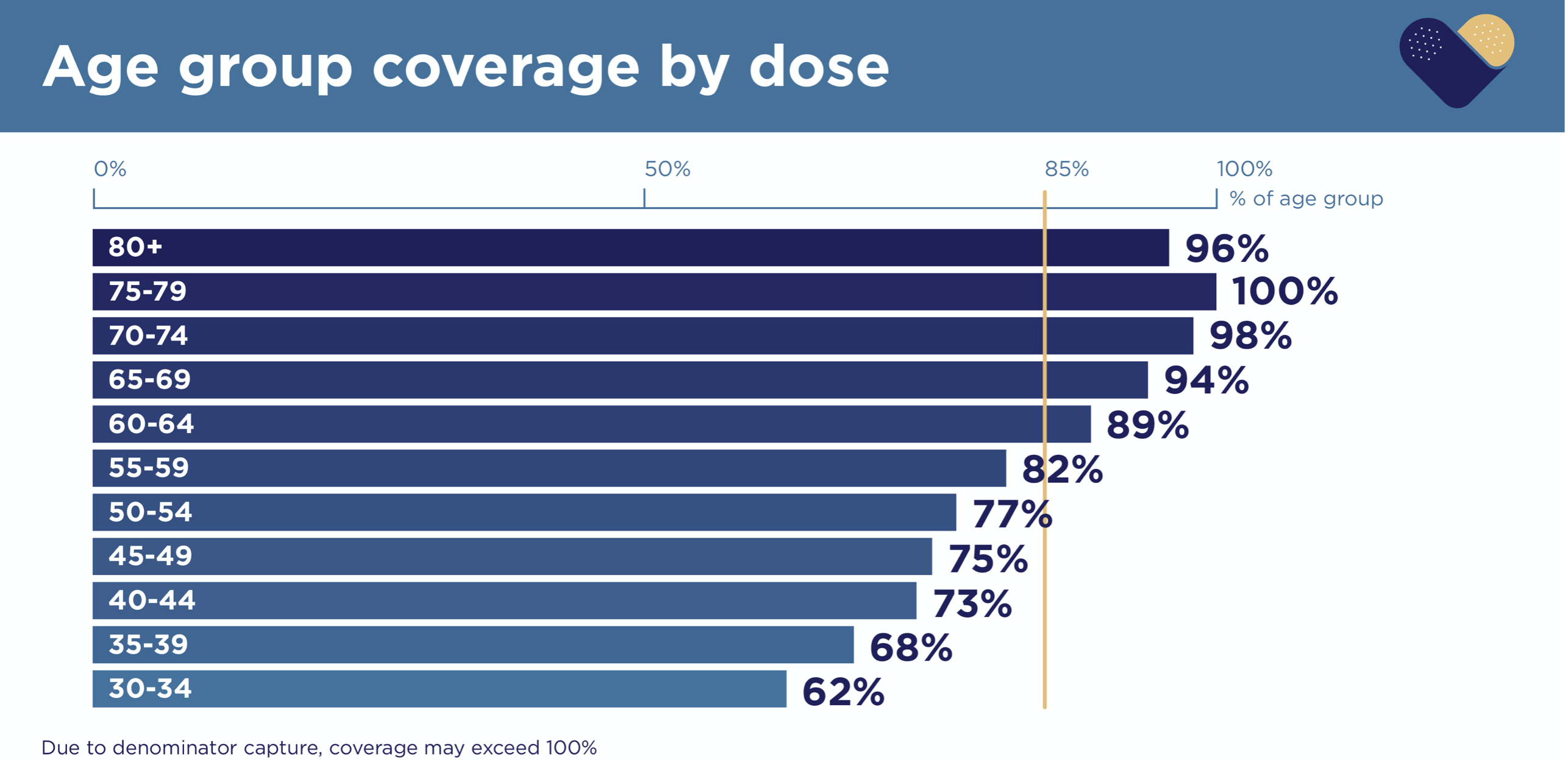 85%标记的垂直黄线代表了有资格接受疫苗的人数(即12岁及以上的人),以达到75%的总人口(包括11名和小孩)。