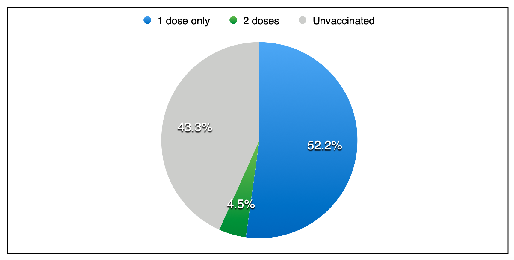昨天,施用5,283剂疫苗。截至昨天的一天结束,施用了594,708剂疫苗,包括43,776秒的剂量;56.7%的整个人口至少接受了至少一种剂量的疫苗。