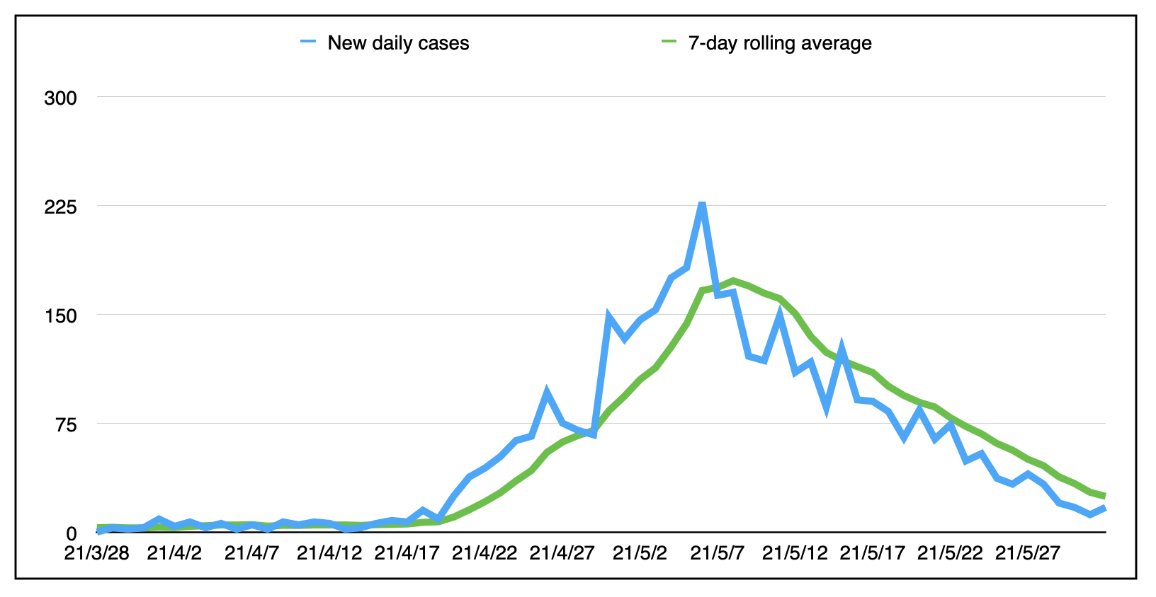 以下是自3月28日(新斯科舍省最后一天没有新增病例)以来的每日新增病例数和7天滚动平均数(今天为24.6):