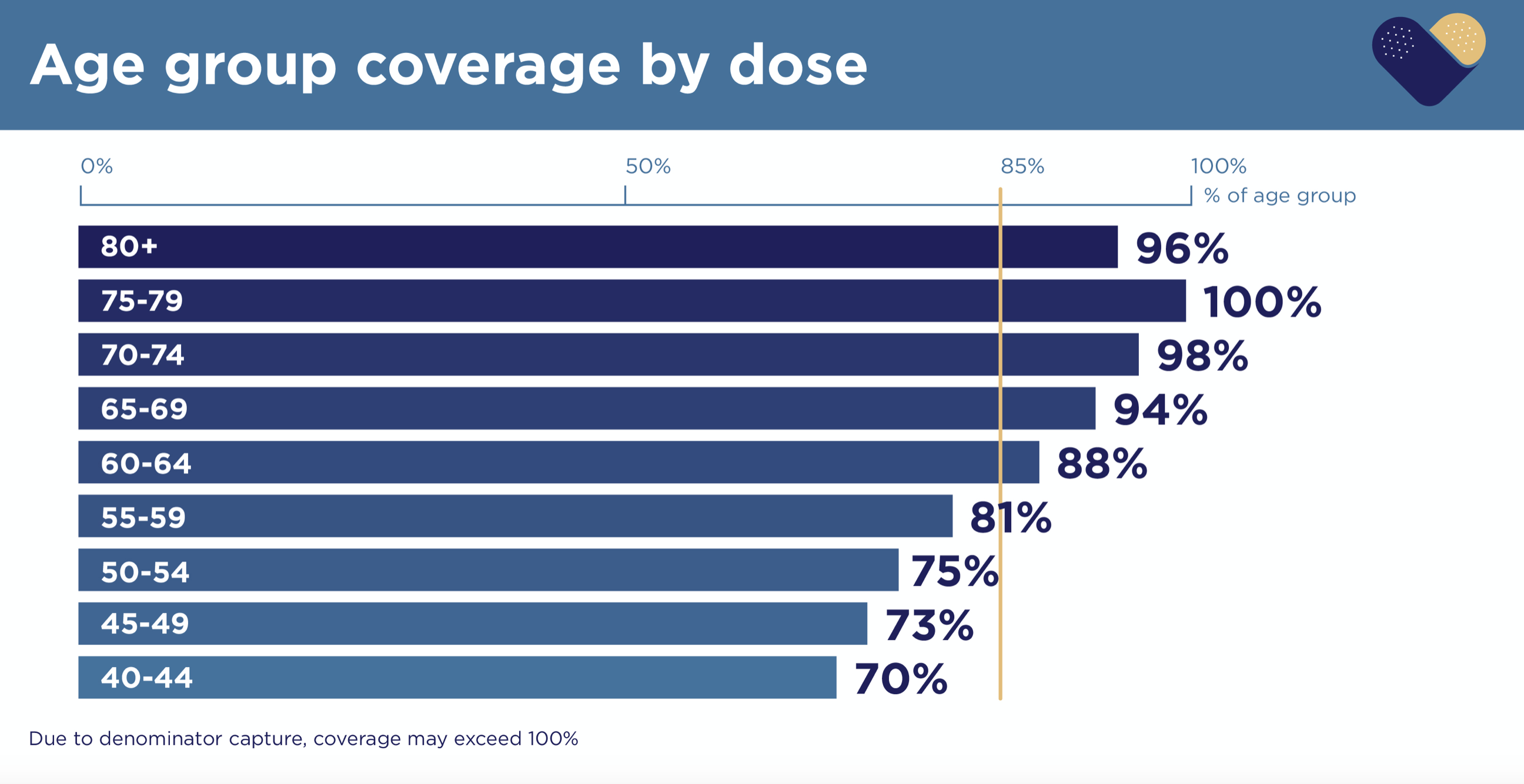 我昨天向卫生部提出了这些担忧,我很高兴地告诉大家,他们做出了积极的回应。首先,他们解释说,每个年龄段(例如,70岁至75岁群体)的比例实际上可能超过100%,因为这是基于2019年人口普查的人口数据,而自那以来人口一直在增长。其次,他们同意我对垂直黄线的批评,并将其提高到85%。以下是修改后的图表: