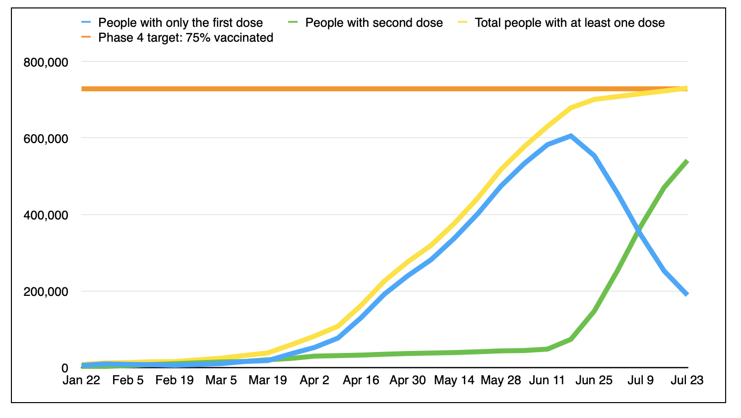 上面的图表显示了随时间疫苗接种的进展,正如周五捕获的那样。蓝线仅是一种剂量的人;绿线是有两剂的人;黄线是至少一种剂量的人,橙线占整个人口的75%。