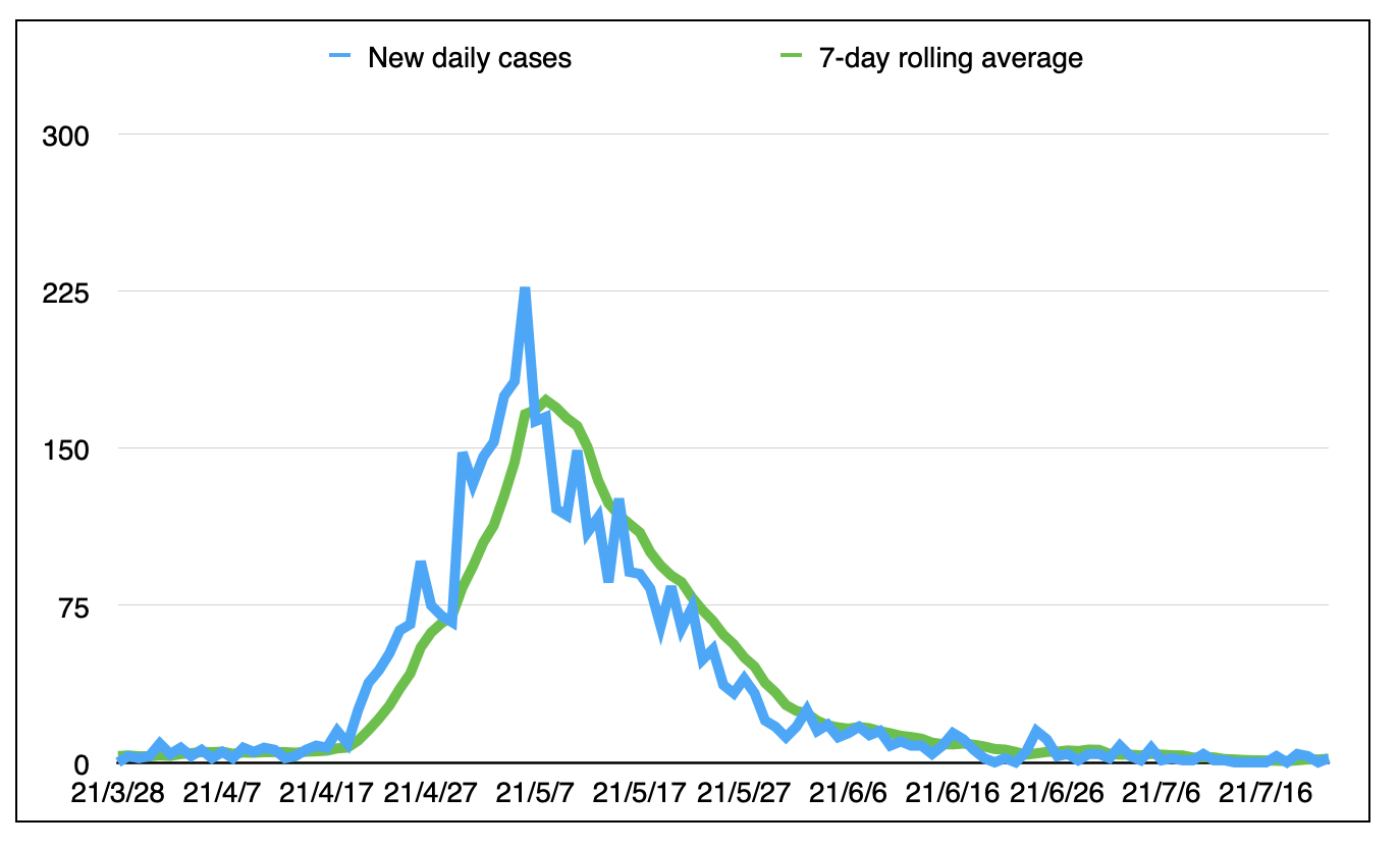 以下是3月28日以来的日常新案例编号和七天的滚动平均值(今天的1.7):