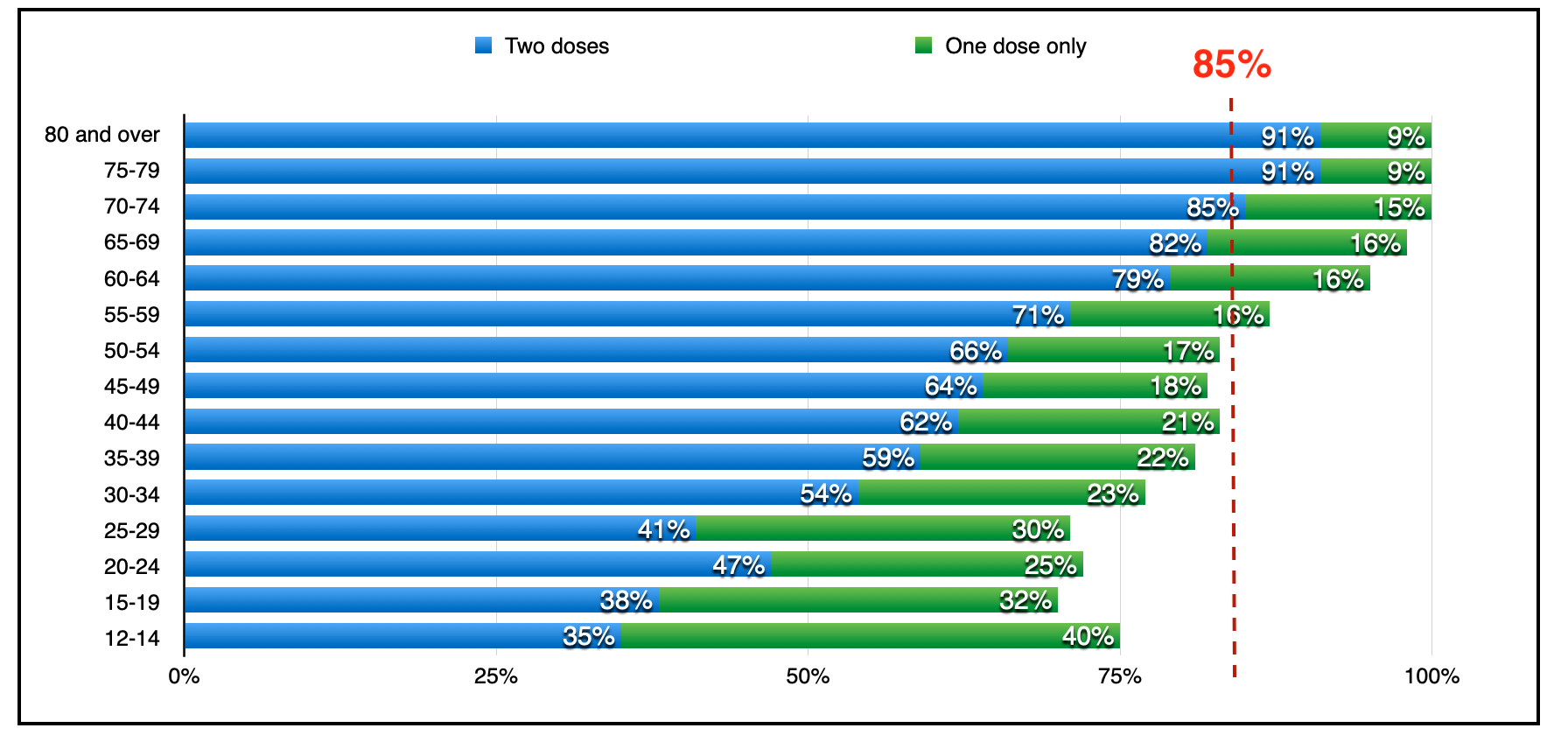 上图显示了已接收一个(绿色)和两种(蓝色)疫苗的每个年龄群组的百分比。85%的线反映了有资格接种疫苗的人的百分比(12岁及以上的人),以便达到整个人口的75%(包括11岁和年轻)用两种剂量接种疫苗,这被认为是需要交叉以获得畜群免疫力的门槛。人口基于2019年人口估计;今天的人口从那时起生长,所以百分比略微偏高。