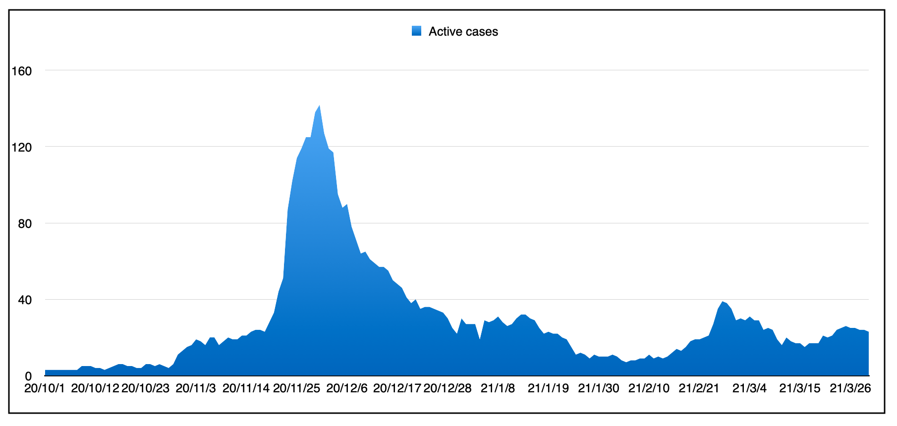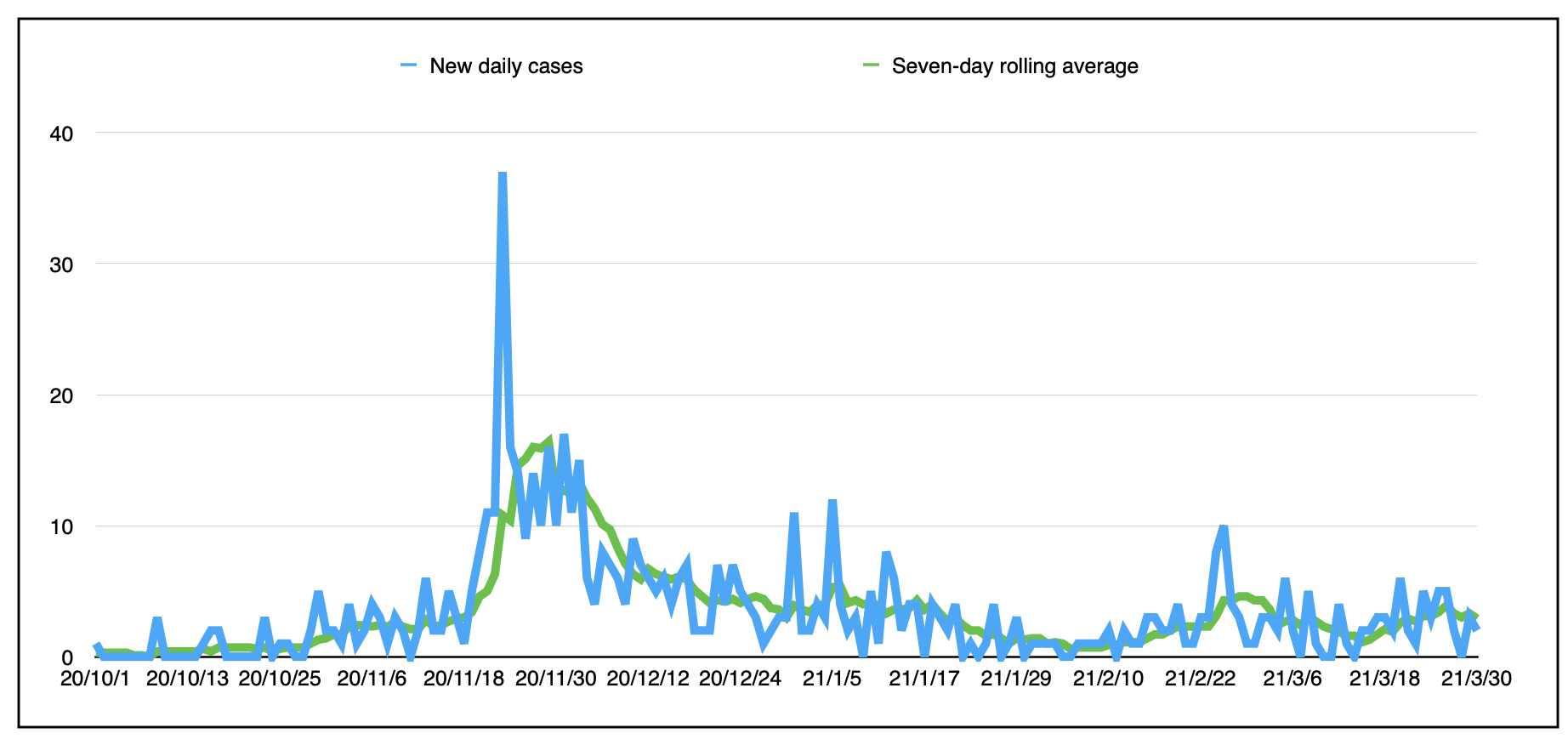 以下是自第二波(10月1日)开始以来的每日新增病例和7天滚动平均值(今天为2.9例):