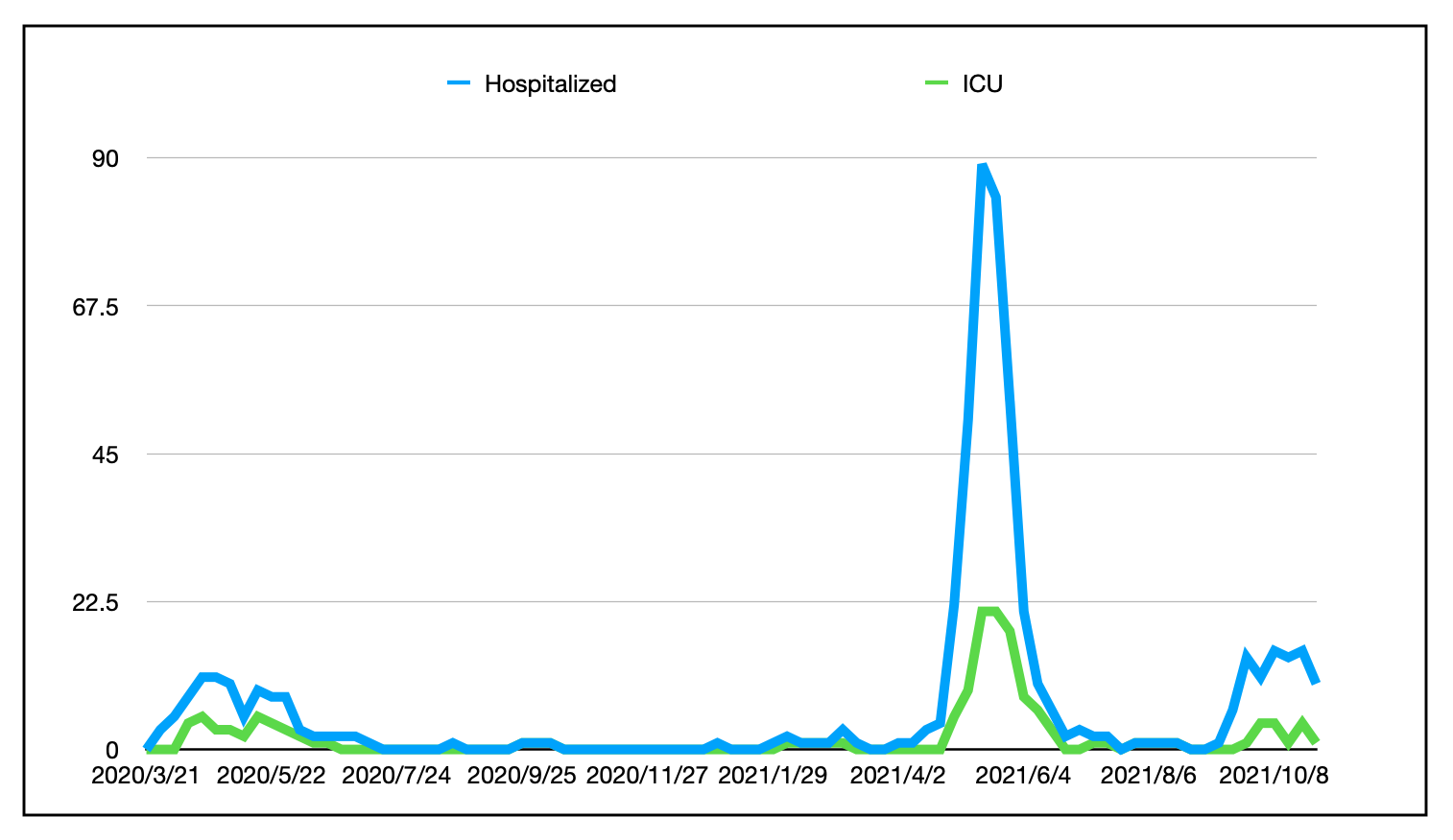 下图显示了流感大流行期间每周五住院和重症监护室的人数。