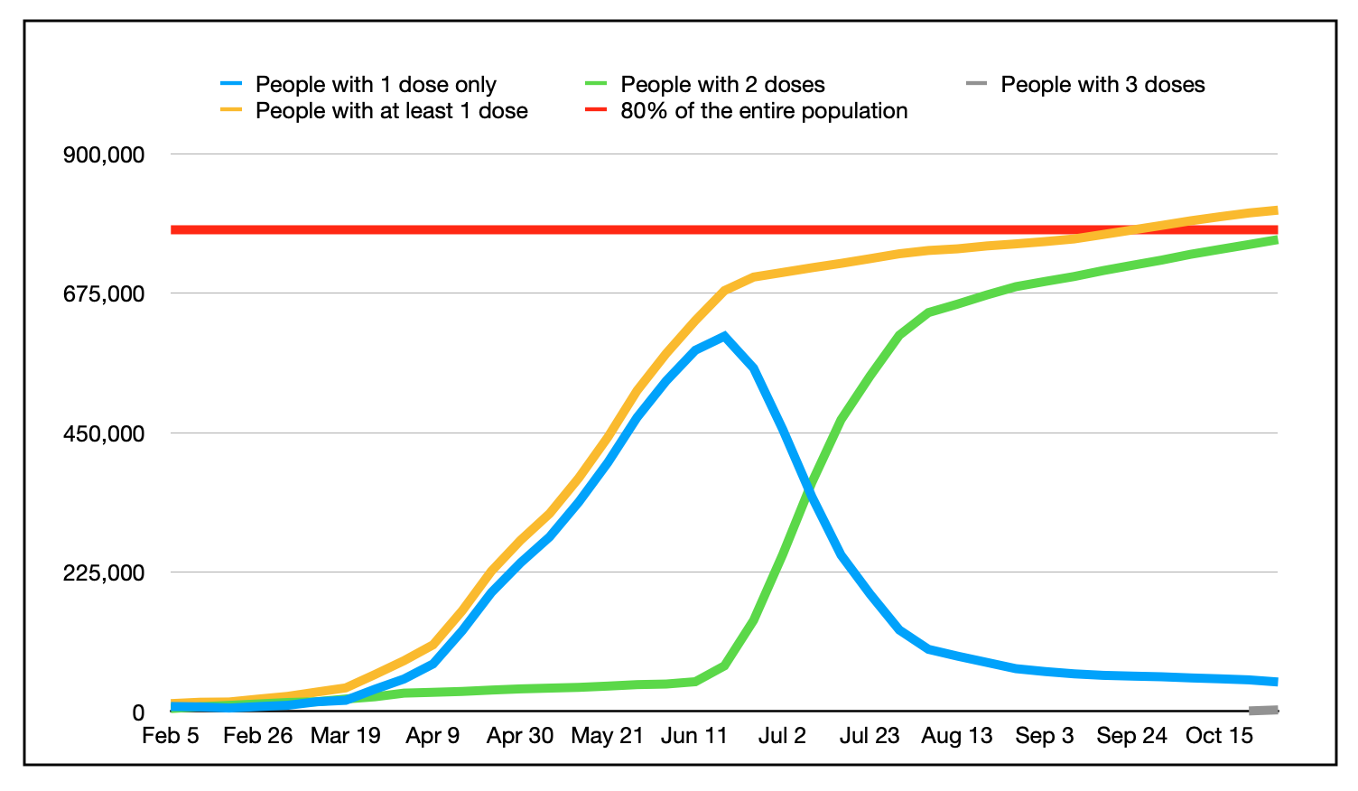 上图显示了流感大流行期间每周五的疫苗接种进展情况。蓝色的线是只接种了一剂疫苗的人;绿线是服用两剂的人;黄金线是人与至少一剂;灰色的线是服用三剂的人;红线表示80%的人口。